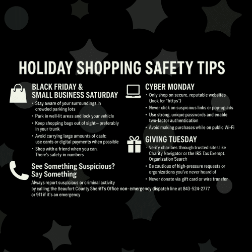 As we head into one of the busiest shopping weekends of the year, the Beaufort County Sheriff’s Office wants to help you stay safe whether you’re shopping in stores, online, or donating to causes you care about.